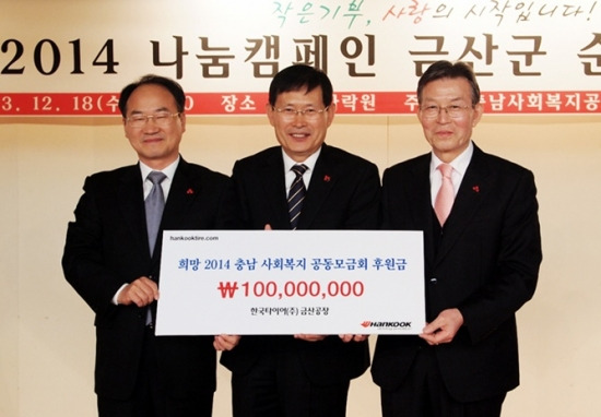 한국타이어는 전날 충남 금산군 금산다락원에서 '이웃사랑 성금 전달식'을 가졌다. 전달식엔 윤정록 한국타이어 금산공장 공장장, 박동철 금산군수, 신한철 충남 사회복지공동모금회 회장 등 200여명이 참석했다.