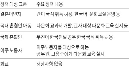용광로 방식은 이민자가 자신의 언어·문화·사회적 특성을 완전히 포기하고 주류 사회의 일원이 되는 것을 지향한다. 우리나라도 이 같은 방식의 이민정책에 기반해 있다. 이민자가 한국어를 습득할 수 있도록 돕고 다문화가정의 자녀가 한국인으로 교육받고 성장할 수 있도록 지원함으로써 동화가 순조롭게 이루어질 수 있도록 한다. <성신여대 2011학년도>에 기출된 표를 통해 구체적인 내용을 살펴보자.