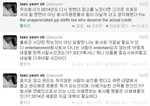 4일 새벽, 옥택연은 자신의 트위터에 3개의 글을 남겼다. 옥택연이 JYP의 인사 방침을 지적한 내용이 담은 글로 JYP의 인사 방식을 공개적으로 비판하기 위해 올린 글이었다. (사진 속 글)