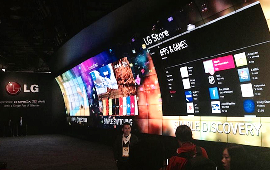 삼성전자와 LG전자는 'CES 2014' 열리고 있는 라스베이거스 컨벤션센터 중앙홀에 가장 큰 부스를 차려놓고 관람객을 맞고 있다. 이들 부스 외벽 대부분은 최첨단 TV들로 도배됐다.