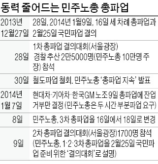 민주노총은 이날 서울광장을 비롯해 전국 14개 지역에서 2차 총파업 결의대회를 열었다. 경찰 추산 6700여명(주최측 추산 2만여명)이 참가했다. 지난달 열린 중앙집행위원회에서 오는 16일 3차 등 세 차례의 총파업과 박근혜 대통령 취임 1주년인 2월25일 국민파업 등을 하기로 한 데 따른 것이다. 당시 결의문 문구는 ‘1차 총파업을 시작으로 1월9일과 16일, 2차·3차 총파업을 조직한다’였다. 민주노총은 전날 애초 평일(목요일)로 예정했던 3차 총파업을 ‘더 많은 조합원 참여를 위해’ 18일(토요일)로 조정한 데 이어 이날은 “2차와 3차 총파업 결의대회는 2월 국민파업을 결의하는 대회이며 파업이 아니다”고 발표했다.