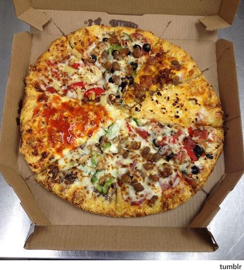공개된 사진에는 8조각이 각각 다른 토핑으로 이루어진 피자가 보인다.