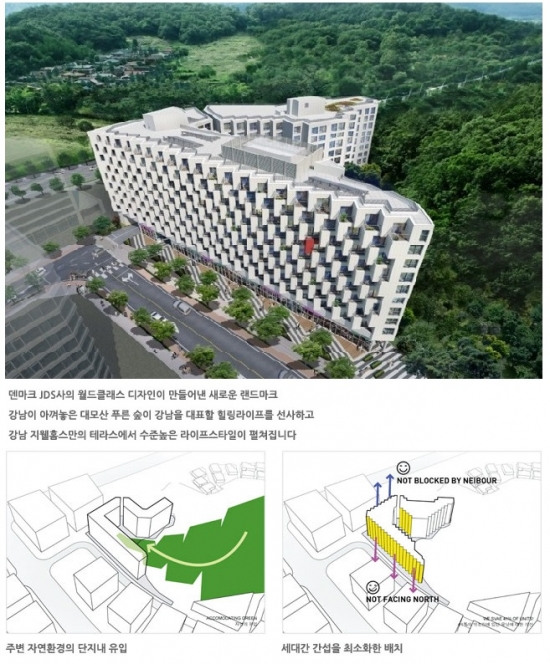 덴마크 JDS사가 건축 설계를 맡은 신영 ‘강남지웰홈스’는 JDS사의 건축 철학을 고스란히 담아 단지 대부분이 강남 대모산 자락 푸른 숲에 둘러싸인 환경 친화적 자연주의 설계의 섬세하고 디테일한 보기 드문 대단지 오피스텔이다. 세대마다 테라스구조 입체적 외관의 조망을 우선시하는 인간 중심적 건축 설계로 세대 간 간섭을 최소화 해 채광효과와 프라이버시 보호를 극대화 하였다는 평가가 나왔다. 때문에 금년 10월 입주 때가 되면 인근 임차 수요자들까지 몰릴 것으로 예상된다.