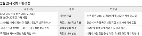 [ 이정호 기자 ] 새누리당과 민주당이 3일 개회하는 2월 임시국회에서 기초연금, 카드사 개인정보 대량유출 사태 등 민감한 현안을 놓고 격돌을 예고하고 있다. 6·4 지방선거를 앞두고 여론몰이와 정국 주도권을 잡기 위한 여야 간 치열한 입법 전쟁이 벌어질 전망이다.