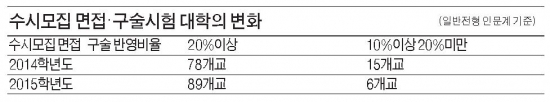 또 정시모집에서는 면접구술시험을 실시하는 대학이 53개 대학으로 전년도에 비해 21개 대학이 감소한 것으로 나타났다.