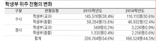 여기에서 학생부 위주 전형만 살펴본다면, 학생부 위주 전형은 비중이 전년보다 10.1%포인트 증가하며, 전체 모집인원의 54.6%인 20만6764명을 선발한다(표1 참조). 이는 2015학년도 총입학정원 37만9107명(100%) 중 수능 위주 입학정원 11만8905명(31.4%)보다 2배 정도 많은 수치이다.