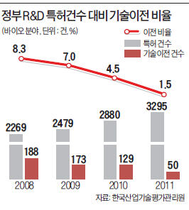 바이오 산업을 키우려면 등록된 바이오특허를 이전받을 수 있도록 여건을 조성할 필요가 있다는 게 바이오 벤처기업인들의 얘기다. 2007년부터 2011년까지 정부 주도로 국내 출원한 바이오특허 1만923건 중 사업화로 기술 이전된 것은 540건으로 전체의 4.9%에 불과하다.