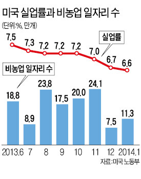 가계를 대상으로 별도 조사하는 실업률은 6.6%로 지난해 12월 6.7%에서 0.1%포인트 추가 하락했다. 작년 1월 7.9%에 달했던 실업률은 1년 새 1.3%포인트나 줄어들었다. 하지만 이는 구직 포기자가 늘어나면서 고용시장 참여자가 줄었기 때문이다. 지난달 고용시장 참여율은 63.0%로 전달 62.8%에 비해서는 다소 나아졌지만 여전히 사상 최저 수준을 유지하고 있다.