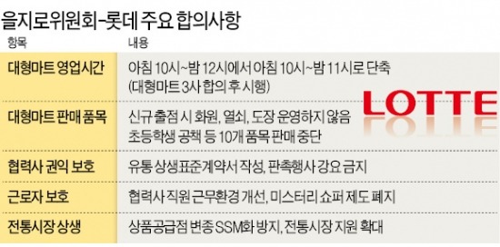 10대 추진 과제 중 핵심은 대형마트 영업시간을 단축하고 일부 품목을 팔지 않겠다는 것이다. 현재 밤 12시까지 운영하고 있는 롯데마트를 밤 11시까지만 영업한다는 것. 유통산업발전법에 따르면 오전 10시부터 밤 12시까지는 영업을 할 수 있도록 돼 있다. 그러나 롯데는 을지로위원회와의 합의에 따라 법이 정한 영업시간에도 장사를 하지 못하게 된 셈이다. 업계의 한 관계자는 “롯데가 이마트 홈플러스와 합의해야 한다는 조건을 달아 ‘수비라인’을 구축한 것만 봐도 얼마나 당혹스러운 요구인지 짐작할 수 있다”며 “국회의원들이 법에 정해진 규정을 무시하고 영업시간을 조정했다는 게 놀랍다”고 말했다.