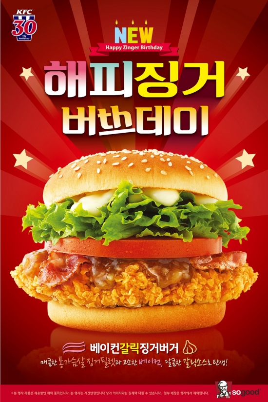 [ 노정동 기자 ] KFC는 신제품 '베이컨갈릭 징거버거' 출시를 기념해 다음 달 20일까지 '해피징거버쓰데이(Happy Zinger Birthday)' 행사를 진행한다고 3일 밝혔다.이번 행사는 올해 한국 진출 30주년을 맞은 KFC가 대표 스테디셀러 메뉴인 징거버거 출시월인 이달에 맞춰 신제품 '베이컨갈릭 징거버거'를 선보여 이를 축하한다는 의미를 담았다.