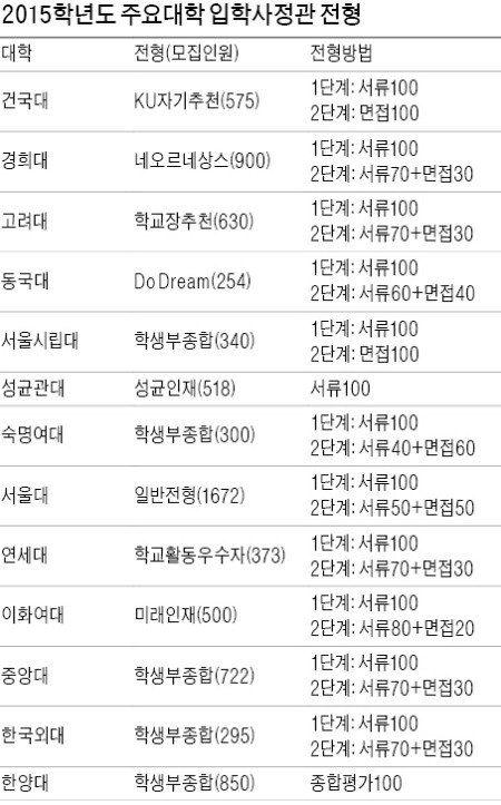 2015학년도에는 기존 입학사정관전형을 포함하는 학생부 종합전형 모집인원이 전년도에 비하여 대폭 증가했다. 지난해 수시모집에서 4만6932명을 선발하던 것에 비해 올해 모집인원은 1만2352명 증가한 5만9284명에 달한다. 정시모집에서 학생부 종합전형 선발인원은 전년도에 비해 921명이 감소한 1335명을 모집한다.