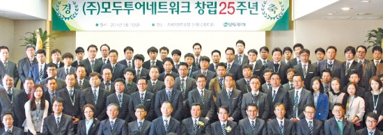 모두투어(modetour.com)가 지난 7일 서울 프레지던트 호텔에서 창립 25주년 기념식을 열었다. 우종웅 회장과 홍기정 부회장, 한옥민 사장 등 200여명의 임직원이 참석한 이날 기념식에서 모두투어는 지난해 어려운 여건에서도 아웃바운드 여행객 송출 100만명과 매출 1400억원 돌파를 자축하는 한편 올해를 글로벌 기업으로 도약하는 원년으로 삼겠다는 의지를 다졌다. 한 사장은 “25년 전 국일여행사의 일원으로 시작해 현재 1000여명의 직원과 함께 국내 선두기업으로 성장한 것에 감회가 남다르다”며 “국내를 넘어 글로벌 관광레저그룹으로 거듭나겠다”고 말했다.