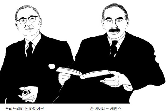 케인스는 1960년대까지 경제학계를 지배했지만 1970년대 불황기 이후 하이에크에게 헤게모니가 넘어갔다. 하지만 2008년 금융위기로 부시 미국 대통령이 무덤에서 케인스를 불러내면서 다시 논쟁이 벌어졌다.