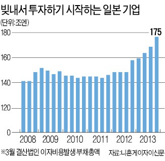 니혼게이자이는 “2008년 리먼사태 이후 줄곧 줄어들던 일본 기업 부채가 작년부터 증가세로 돌아서는 분위기”라며 “아베노믹스와 추가적인 양적완화로 디플레이션 탈출에 대한 기대가 높아진 것이 부채 규모 증가의 배경”이라고 설명했다.