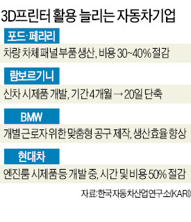 실제 현대차도 3D프린터로 엔진룸 시제품을 만들어 개발 기간(60일→30일)과 비용(3억원→1억4000만원)을 절반으로 줄인 것으로 전해졌다.