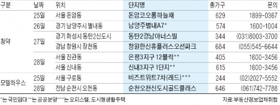 23일 부동산업계에 따르면 이번주(24~30일) 총 19개 사업장에서 9893가구가 분양된다. 25일 코오롱글로벌이 서울 성북동에서 ‘돈암 코오롱하늘채’(전용 59~113㎡)를 공급한다. 629가구 중 257가구가 일반분양 물량으로 3.3㎡당 평균 분양가는 1431만원이다. 예정 입주 시기는 2016년 12월이다.