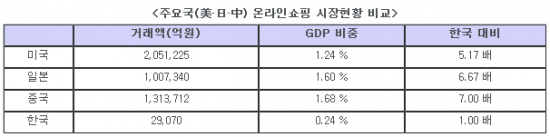 유환익 전경련 산업본부장은 산업연구원과 세계은행 통계를 인용해 “우리나라는 IT(정보기술) 선진국으로 평가됨에도 불구하고 GDP 내 온라인쇼핑의 비중이 미국, 일본, 중국에 비해 5분의 1에서 7분의 1 수준에 불과한 실정”이라고 분석했습니다. [표참조=전경련제공]