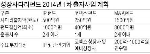 중견·중소기업이 인수합병(M&A)을 통해 성장 발판을 마련하도록 지원하는 3000억원 규모 M&A펀드가 하반기 중 출범한다. 또 특허 등 우수한 지식재산권(IP·Intellectual Property)을 보유한 중견·중소기업에 투자하는 IP펀드와 코넥스시장 상장기업 및 상장 예정기업에 투자하는 코넥스펀드가 각각 1000억원과 400억원 규모로 조성된다.