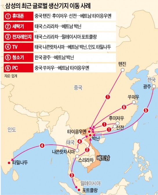 삼성전자 고위 관계자는 “중국 각지에 있는 가전 공장들도 베트남 라오스 캄보디아 등 동남아로 옮기는 것을 검토하고 있다”고 말했다. 중국에서 가까워 현지 부품 업체들을 그대로 이용할 수 있어서다. 이 과정에서 인건비가 싸고 인력 수준이 높은 베트남이 우선 투자 대상으로 검토되고 있다는 것이다.