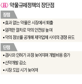 존 버논 듀크대 경제학과 교수 등 보건경제학자들은 약물 규제 정책의 장단점을 분석했다.<표 참조> 철저한 규제로 효과가 없는 약물을 시장에서 퇴출시키고, 엄격한 검사 절차와 임상시험으로 안전성을 높인다는 것은 장점이다. 또 약물이 갖는 편익과 위험에 대한 정보를 공개해 제약업체 사이의 가격 경쟁을 유도하는 것도 긍정적이다. 다만 검사나 인허가 과정이 길어지면서 개발비용이 늘어나는 것은 단점으로 꼽는다. 신약의 수가 줄고 시장에 도입되는 기간이 늦어지기 때문이다.