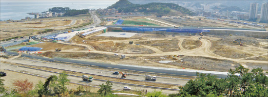 16일 오전 부산 기장군 기장읍 대변리에 위치한 동부산관광단지에서는 롯데쇼핑이 추진하는 복합쇼핑몰 공사가 한창이었다. 25t 덤프트럭 30여대와 포클레인 10여대가 공사현장에서 나오는 흙을 밖으로 실어나르는 작업을 했다. 지난 1월 착공한 복합쇼핑몰은 올 하반기 완공된다. 바로 옆에선 동부산G&R이 오는 10월 개장을 목표로 건설 중인 골프장(18홀)의 클럽하우스 공사가 한창이었다. 힐튼컨소시엄도 호텔과 콘도를 착공했다.
