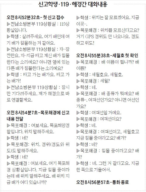 하지만 8시54분7초에 신고 접수가 돼 통화가 끝난 8시56분57초까지 2분50초간 학생은 해경에 똑같은 신고를 되풀이해야 했다. 해경은 다짜고짜 신고자가 알 수 없는 경·위도를 물었고 엉뚱하게 출항 장소를 묻는 사이 배는 서서히 가라앉고 있었다. 가장 중요한 배이름을 물은 것은 이보다 늦은 8시55분38초. 상황의 다급함을 인지했더라면 먼저 구조헬기와 구조선 출동을 지시했어야 했다. 그러나 해경은 이후에도 배 종류가 여객선인지 어선인지를 물었다. 또 지금 침몰 중이냐고 다시 묻자 “예?”하고 반문하는 내용도 실려 있어 신고 과정의 답답함이 그대로 묻어났다. 그런 후에도 해경의 동문서답식 신고 접수는 계속됐다. “한쪽으로 기울어서 침몰 중이라고요”. “여보세요? 혹시 옆에 누구 있습니까?” 신고 학생은 “선생님이 계신데 정신이 없어 대신 전화했다”는 설명을 해야 했다.