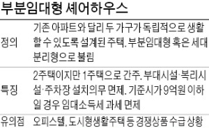 현석동에 들어서는 ‘래미안 마포 웰스트림’은 전용 84㎡ 64가구를 부분임대형으로 짓고 있다. 대치동 ‘대치우성2차’를 리모델링한 ‘대치 래미안 하이스턴’은 국내에서는 처음으로 부분임대형이 공급된 리모델링 단지다. 전용 110㎡ 3가구가 부분임대형이다.전문가들은 이 같은 부분임대형 셰어하우스가 앞으로 더 늘어날 것으로 내다봤다. 1~2인 가구가 급속히 늘어나는 인구구조를 생각하면 피할 수 없는 선택이라는 얘기다. 장대섭 명지대 부동산대학원 교수는 “중대형 면적 아파트의 노는 공간을 임대주택으로 바꿔 임대수익을 올리는 부분임대형 주택이 늘어날 수밖에 없다”며 “다만 입지는 도심, 역세권, 대학가나 일터 주변으로 한정될 것”이라고 설명했다.