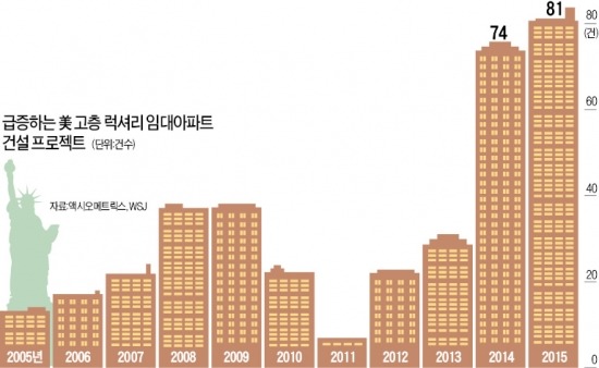 미니애폴리스뿐 아니다. 미국 전역의 다운타운에 15층 이상의 고층 럭셔리 임대용 아파트가 빠르게 들어서고 있다. 임대용 아파트는 기업이 건물을 소유한 채 입주자에게 임대하는 아파트다. 미국에서 개인이 소유하는 아파트는 ‘콘도미니엄’이라고 부른다. 시장정보회사 액시오메트릭스에 따르면 올해에만 74개의 고층 임대용 아파트가 미국에 들어설 전망이다. 내년에 완공되는 건설 프로젝트는 81개에 달한다. 1970년대 이후 가장 많은 숫자라고 월스트리트저널(WSJ)은 전했다.