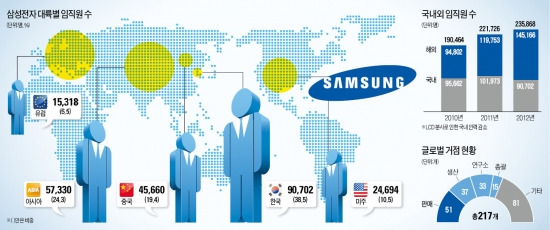 삼성의 핵심 계열사인 삼성전자는 매출의 90%가량이 해외에서 발생한다. 임직원 규모도 해외가 14만명으로 국내 9만명보다 훨씬 많다. 삼성전자 고위 관계자는 “언제까지나 한국인 직원이 해외에 가서 현지 법인을 맡을 순 없다”며 “진정한 글로벌 기업이 되려면 현지 임직원이 해외 법인을 이끌어야 한다”고 말했다.