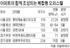 이에 따라 최근 복합형 오피스텔 분양이 늘어나는 추세다. 롯데건설은 서울 독산동에서 ‘롯데캐슬 골드파크 2차’ 오피스텔을 분양 중이다. 오피스텔 178실(전용 27~29㎡)과 아파트 292가구(전용 59~84㎡)로 이뤄진 단지로 27㎡ 물량이 소량 남아 있다. 삼성물산은 이달 서울 한강로2가 용산역 전면3구역에서 ‘래미안 용산’을 선보인다.
