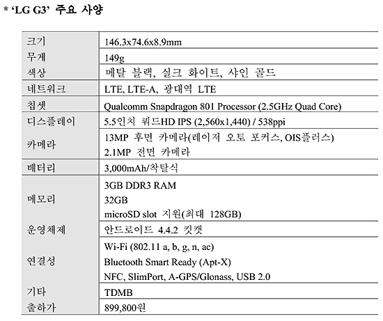 출고가가 89만 9800원(32GB 모델)으로 최종 확정됐다. 최대 경쟁작인 삼성전자 '갤럭시S 5'는 86만 6800원. 국내외 대표 스마트폰 제조사인 삼성전자와 LG전자의 최고 전략폰 가격이 모두 80만원대로 진입했다.