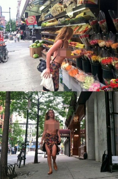 공개된 사진에서 스카우트 윌리스는 꽃무늬 치마와 갈색 신발만을 착용하고 상반신에는 아무 것도 걸치지 않은 채 검은 가방 하나만을 매고 있다. 당당하게 뉴욕 시내를 걸어가는 스카우트 윌리스는 도중 꽃가게에 들려 태연하게 꽃을 고르기도 했다.