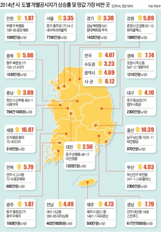 반면 인천과 광주는 1.87%로 땅값 상승률이 가장 낮았다. 박종원 국토교통부 부동산평가과장은 “인천은 영종도 경제자유구역 해제, 용유·무의 관광단지 사업 무산 등의 영향을 받았고 광주는 도심 공동화 현상이 발목을 잡았다”고 설명했다.