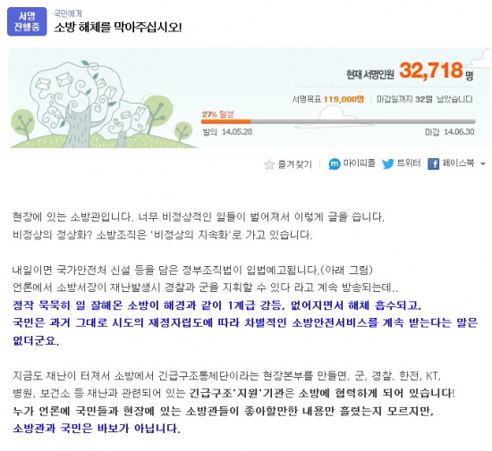지난 28일 포털사이트 다음 아고라의 이슈청원을 통해 발의된 '소방해체를 막아주십시오'라는 제목의 글을 공개했다.