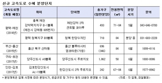 올해 완공 예정인 평택-제천 고속도로를 비롯해 울산-포항 고속도로(2015년 예정), 구리-포천 고속도로(2017년 예정), 인천-김포 고속도로(2017년 예정) 등 신규 고속도로 인근 지역에 분양 단지가 속속 등장하면서 내 집 마련 수요자들의 눈길을 끌고 있다.
