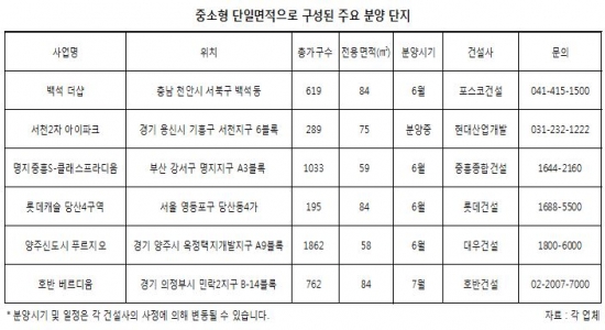 현대산업개발이 지난 23일 경기도 용인시 서천지구 6블록에 ‘서천2차 아이파크’ 모델하우스를 오픈하고 분양중인 이 아파트는 틈새면적인 전용면적 75㎡ 단일형으로 구성된다. 지하 3층~지상 13층, 6개동, 총 289가구 규모다. 주택형별로는 75㎡A 96가구, 75㎡B 167가구, 75㎡C 26가구다. 단일면적이지만 수요자의 주거 스타일에 맞게 선택할 수 있도록 했다.중흥종합건설은 6월, 부산 강서구 명지지구 A3블록에서 ‘명지중흥S-클래스 프라디움’을 분양할 예정이다. 지하 2층~지상 최고 29층, 9개동, 전용면적 59㎡, 1033가구의 대규모 단지다. 총 5개 주택형으로 구성되며, 일부 주택형에서는 59㎡에서 보기 힘든 4베이 평면이 적용된다.