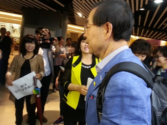 이날 박 후보는 오전 10시부터 롯데백화점 잠실점 지하 입구 앞에서 박용모 새정치민주연합 송파구청장 후보 등과 함께 ‘잊지 않겠습니다’라고 적힌 피켓을 들고 아무 말 없이 서있었다.