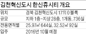 한국도로공사 한국전력기술 등 12개 공공기관이 이전하는 경북 김천혁신도시에서 임대 수익형 오피스텔이 분양된다. 한국토지신탁이 시행하고 한신공영이 시공하는 ‘김천혁신도시 한신휴시티’ 오피스텔이다. 김천혁신도시 중심상업지구에 들어서는 이 오피스텔은 지하 1층~지상 28층 1개동 규모다. 736실(전용 25.97~32.52㎡)로 이뤄진다. 오는 20일 1순위 접수를 시작으로 23일까지 청약일정이 진행된다. 당첨자는 24일 발표한다.