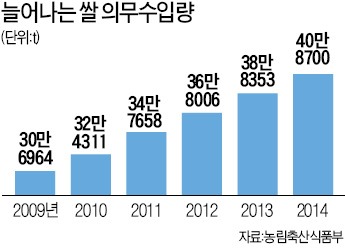 문제는 이 같은 상황에도 매년 비싼 값에 쌀을 들여올 수밖에 없다는 것. 2004년 한국이 쌀 시장 개방을 10년 더 미루면서 WTO 회원국과 유예협상을 할 때 나라별 MMA 쿼터를 받았다. 매년 중국으로부터 11만6000, 미국 5만, 태국 2만9000, 호주에서 9000 등을 수입해야 한다. 농식품부 관계자는 “나라별 쿼터 때문에 수입쌀 가격 변동 등 상황에 따라 수입물량을 조정할 수 있는 여력이 없다”고 토로했다.
