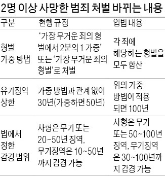 국무회의는 24일 이 같은 내용을 담은 ‘다중 인명피해 범죄의 경합범 가중에 관한 특례법’ 제정안을 의결했다. 정부는 박근혜 대통령의 서명을 거친 뒤 이르면 이달 말 국회에 법안을 제출할 예정이다. 국회 논의가 필요한 만큼 통과 예상 시기는 잡지 않았다.이 법안은 고의 또는 과실로 2명 이상을 죽게 한 ‘다중 인명피해 범죄’를 저질렀을 때 범죄자에 대한 처벌을 대폭 강화하는 게 핵심이다. 현행 형법은 범죄자가 여러 개의 죄를 저질렀을 때, 즉 여러 명을 사망케 했을 때 형벌을 가중하는 방법을 두 가지로 나누고 있다. ‘여러 번의 범죄행위’로 여러 명을 죽였을 때는 가장 무거운 죄의 형벌에 2분의 1을 가중할 수 있다. 반면 ‘한 번의 범죄행위’로 여러 명을 죽였을 때는 가장 무거운 죄로만 처벌토록 하고 있다.