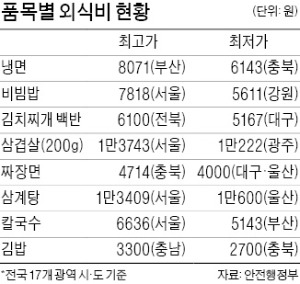 안행부에 따르면 지난 3월 기준으로 냉면 가격은 부산이 8071원으로 가장 비쌌고, 충북이 6143원으로 가장 쌌다. 같은 품목인데도 2000원가량 차이 나는 것이다. 비빔밥은 서울이 7818원으로 가장 높았고 강원이 5611원으로 가장 낮았다. 200g 기준 삼겹살도 서울이 1만3743원으로 가장 비쌌고 광주는 1만222원으로 가장 쌌다. 삼겹살은 8개 품목 중 최고가와 최저가의 격차가 3521원으로 가장 컸다. 8개 품목 중 서울은 비빔밥을 비롯해 삼겹살 삼계탕 칼국수 등 네 개 품목의 가격이 가장 비쌌다. 반면 울산은 짜장면과 삼계탕 등 두 품목에서 가격이 가장 낮게 책정됐다.