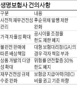 금융회사 보험대리점과 빠르게 덩치가 커지고 있는 대형 독립법인대리점(GA)의 배상책임도 강화해야 한다고 주장했다. 지금은 불완전 판매에 대한 배상책임을 보험사가 지고 있어 판매사의 도덕적 해이를 부추긴다는 판단에서다. 보험료 결정의 자율성을 달라는 요청도 했다. 보험금에 제시하는 이율인 공시이율의 자율조정 범위를 넓히고, 다양한 상품개발을 위해 위험률 안전할증 ‘30% 한도’를 폐지해야 한다는 주장이다.