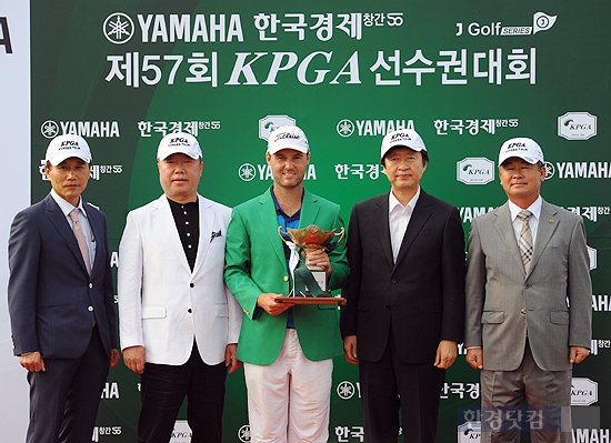 [변성현 기자] 13일 인천 영종도 스카이72 골프클럽 하늘코스에서 '야마하·한국경제 2014 KPGA선수권대회'(총상금 10억원·우승상금 2억원) 최종라운드가 열렸다. 왼쪽부터 김영재 스카이72 대표, 이갑종 야마하 회장, 우승자 매슈 그리핀, 김기웅 한국경제신문 사장, 황성하 KPGA 회장.