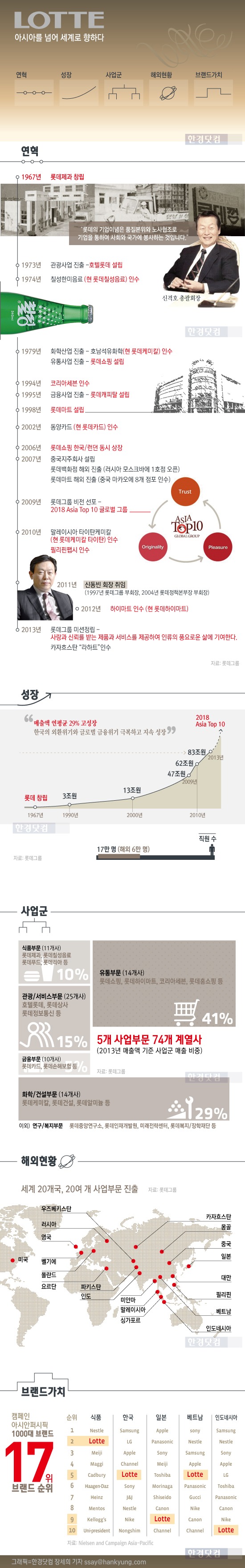 주요 계열사는 롯데쇼핑, 롯데하이마트, 롯데제과, 롯데칠성음료, 롯데리아, 호텔롯데, 롯데케미칼, 롯데건설 등이다. 지난해 그룹 매출은 83조원, 국내외 임직원은 17만명 수준이다.