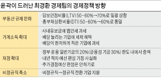 최경환 부총리 겸 기획재정부 장관이 16일 밝힌 향후 경제운용 방향의 핵심은 ‘경기부양+가계 소득 증대’다. 부동산 규제와 돈을 풀어 경기 급락을 막고 기업이 과도하게 쌓아둔 돈이 배당이나 임금을 통해 가계 부문으로 흐르도록 하겠다는 구상이다.