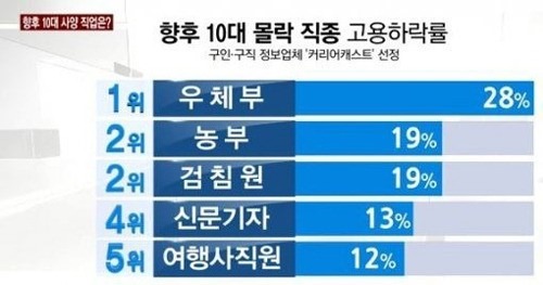 우체부를 이어 농부(19%), 검침원(19%), 신문기자(13%), 여행사 직원(12%)이 '10대 몰락 직종'에 들었다.