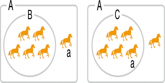 2) n≥1이고, Ρ(n)이 참이라고 가정하자. n+1마리의 말로 이루어진 임의의 집합 A가 있을 때 A에서 특정한 말 한 마리(이름을 a라고 하자)를 제외하고 나머지 n마리의 말로 구성된 집합을 B라 하자. 그러면 집합 B에는 n마리의 말이 있으므로, 가정에 의하여 집합 B의 모든 말은 색이 같다.