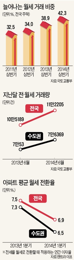 집주인은 저금리 속에서 월세 선호가 뚜렷하다. 전세금을 받아도 마땅한 투자처를 찾기 힘든 게 현실이다. 김혜현 렌트라이프 사장은 “다세대와 연립주택에서 흔했던 월세가 아파트로 빠르게 확산되고 있다”며 “집주인은 월세를 받는 게 시중은행의 2%대 저금리(전세금)보다 유리하고 세입자는 목돈 마련의 부담을 덜 수 있는 점이 결합되면서 이 같은 현상이 나타나고 있다”고 분석했다.