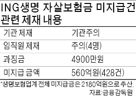 금융감독원은 24일 임시 제재심의위원회를 열고 ING생명의 자살보험금 미지급건에 대한 제재 안건을 의결했다. ING생명엔 ‘기관주의’와 함께 과징금 4900만원을 부과했다. 임직원 4명도 ‘주의’ 조치를 받았다.금감원은 특히 기존 미지급 자살보험금 560억원(428건)을 추가 지급하라는 결론을 냈다. 금감원은 지난해 8월 ING생명에 대한 종합검사 과정에서 종신보험 재해사망특약에 가입한 뒤 2년이 지나 자살한 가입자의 보험금 560억원(2003~2010년)을 지급하지 않은 사실을 적발해 지난 6월 경징계와 과징금을 사전 통보한 바 있다.