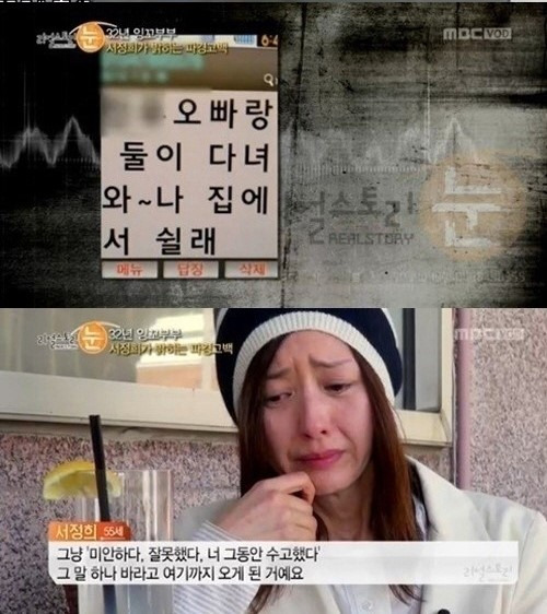 서정희는 눈물을 흘리며 `열아홉 살에 시집 와서 지금까지 32년 동안 남편만 바라보고 살았다. 그 부분에 대해선 어느 누구도 저한테 나쁘다고 할 수 없다`고 고백했다.